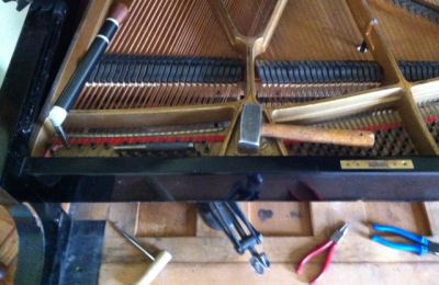 De nieuwe besnaring zit er op, nu nog de dempers vervangen, optrekken en flink aantel keren door stemmen.